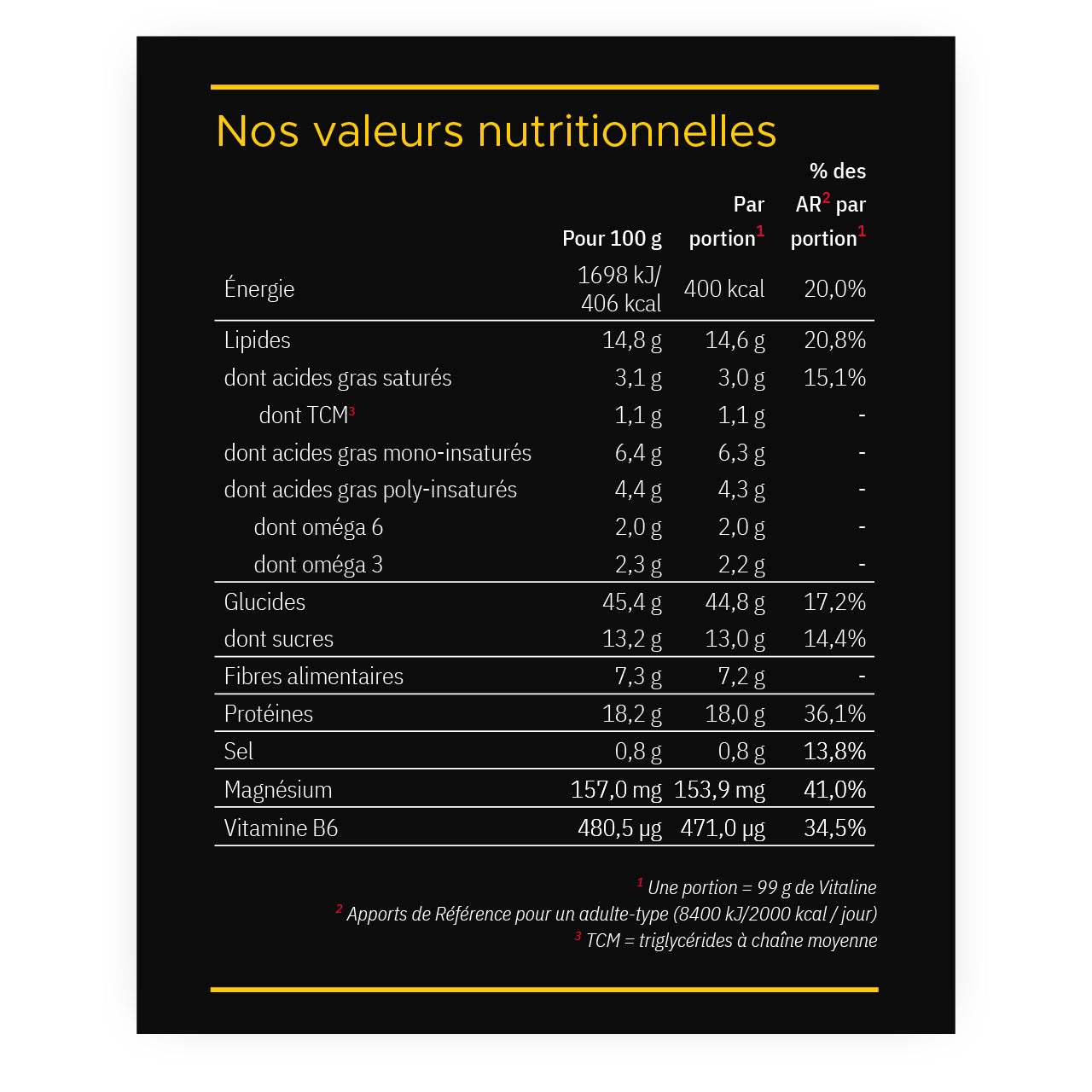 Vitaline Focus a été développée pour favoriser la concentration, stimuler les capacités cognitives et diminuer l’anxiété pendant 3h à 6h, tout en satisfaisant votre besoin alimentaire.