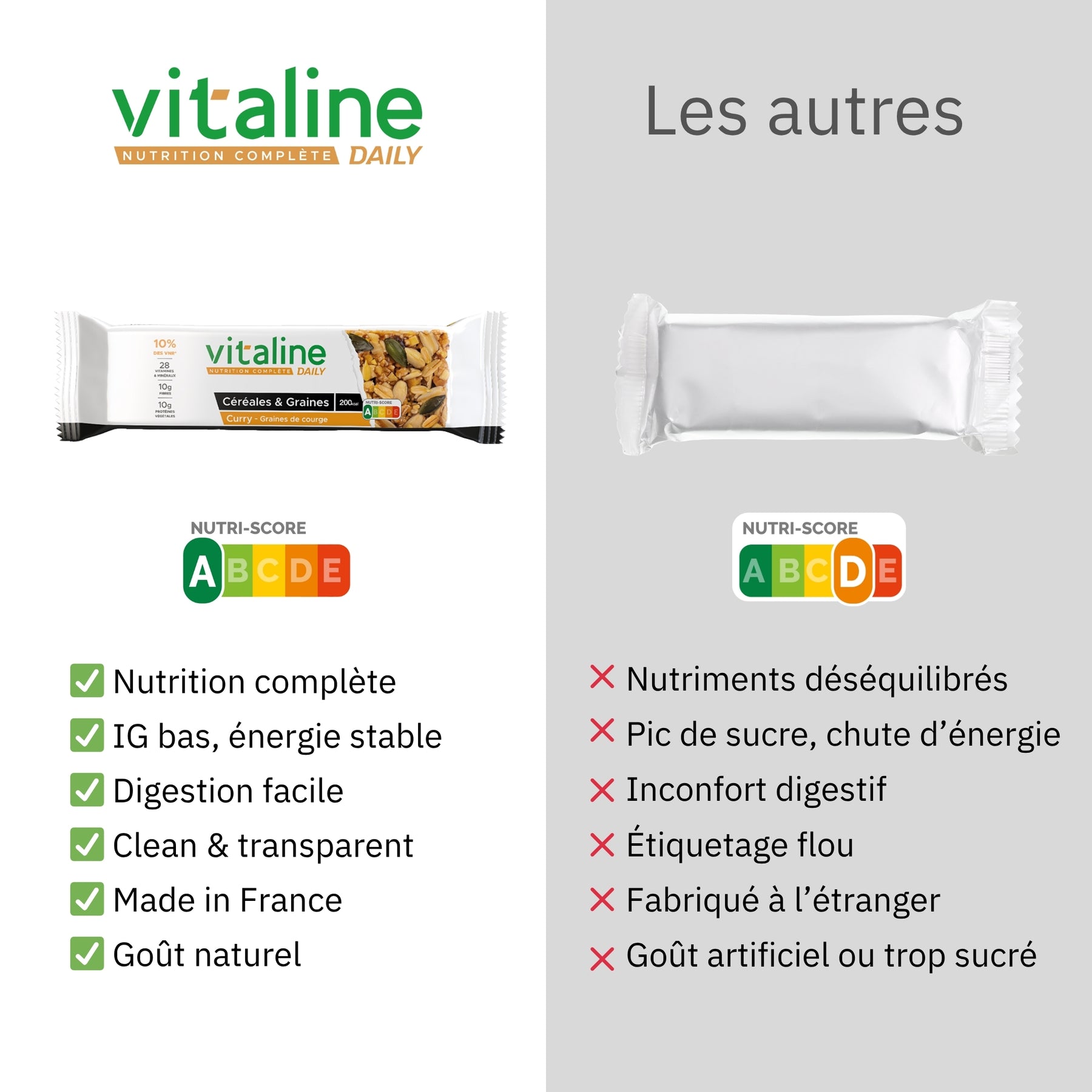 Élaborée pour offrir une nutrition saine et performante, la barre Vitaline Daily est un aliment complet de 200 kcal.