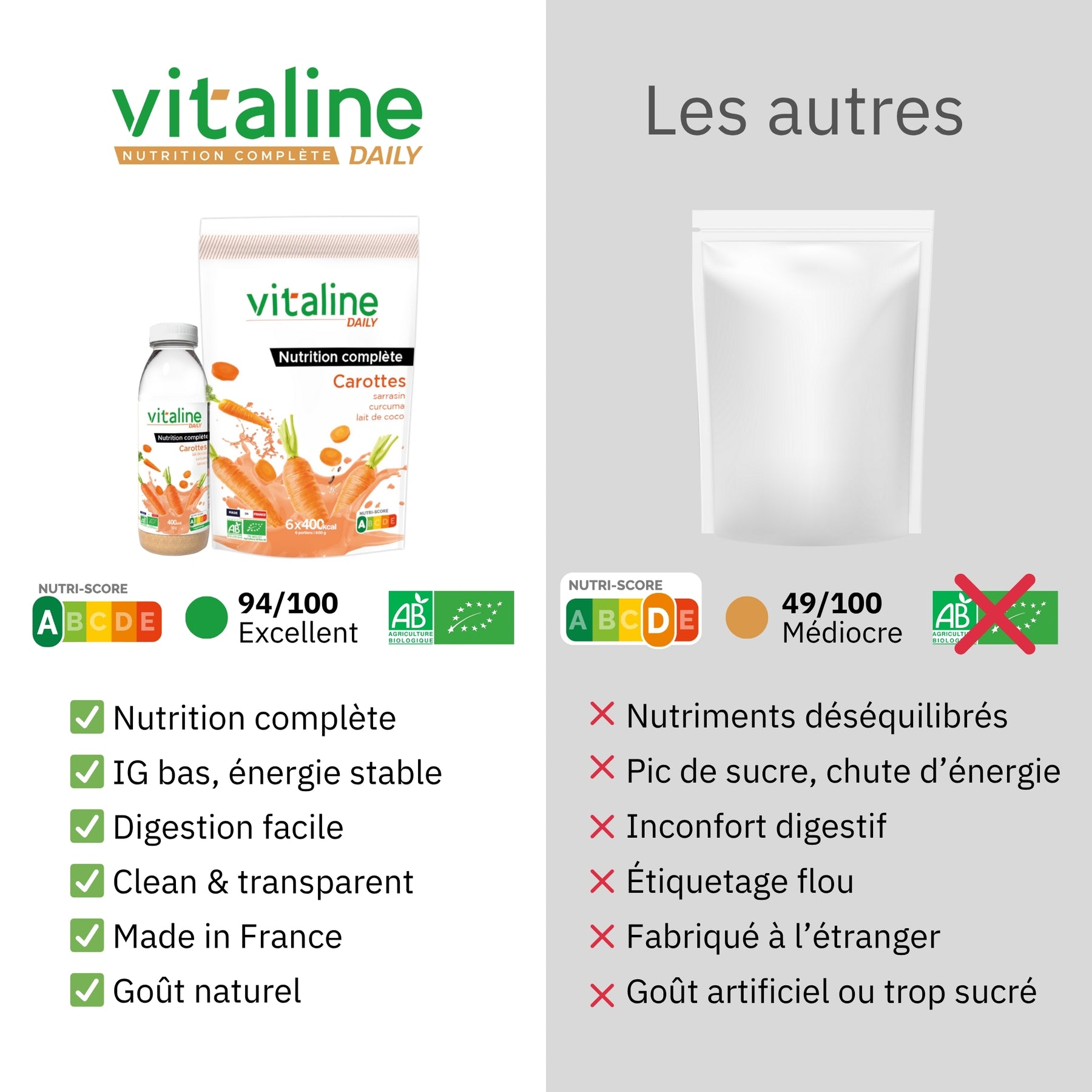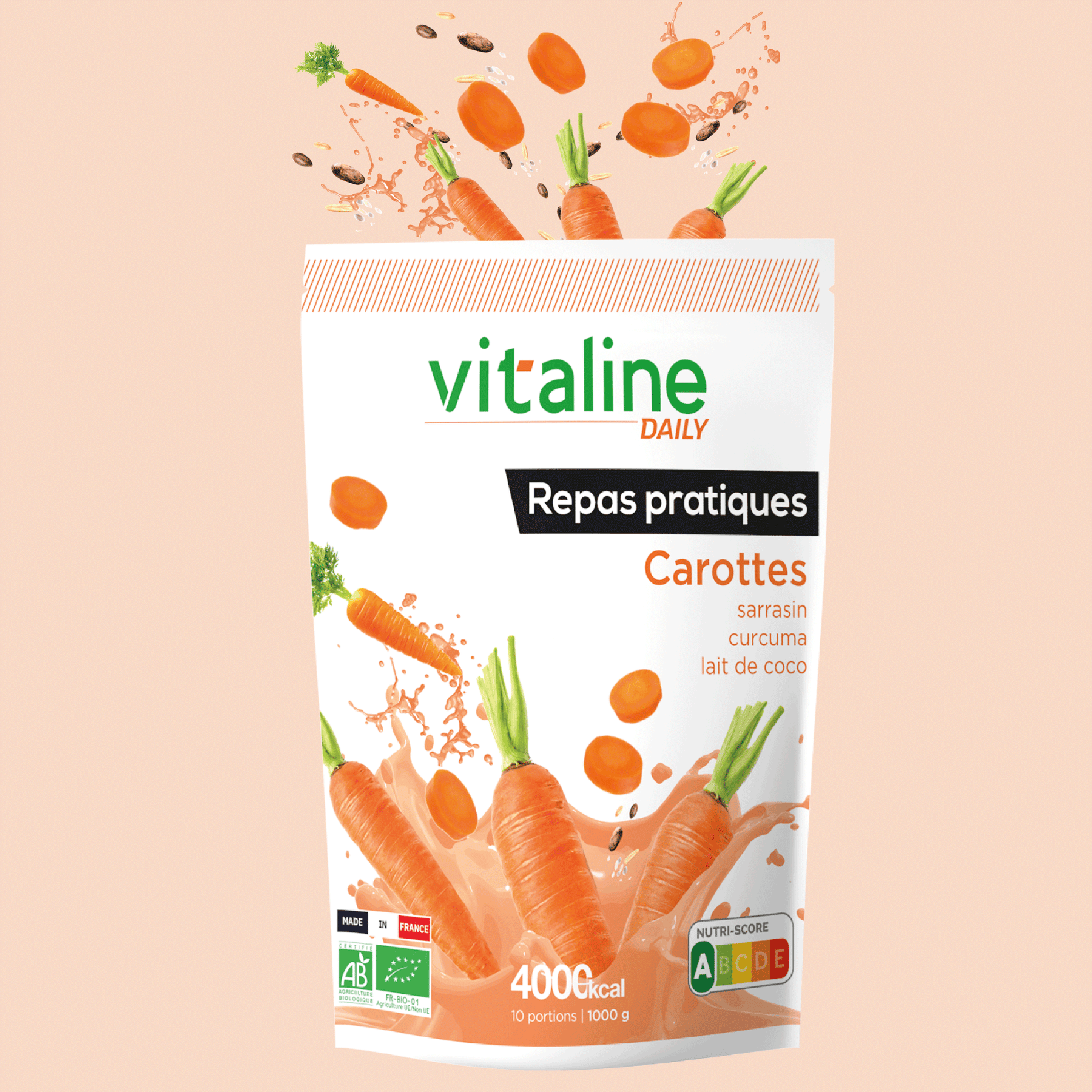 Vitaline Daily - Carottes, sarrasin, curcuma, lait de coco associe la performance nutritionnelle de Vitaline et le goût naturel et réconfortant des carottes, relevé par une pointe de curcuma.